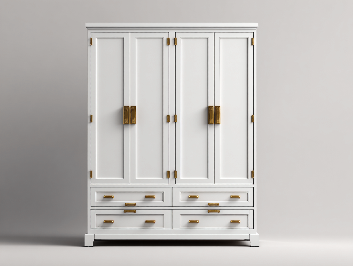 L'armadio è realizzato con struttura solida e finitura di colore bianco. Le superfici sono lavorate con attenzione ai dettagli, mentre la ferramenta in tonalità coordinata contribuisce a un aspetto elegante e uniforme.