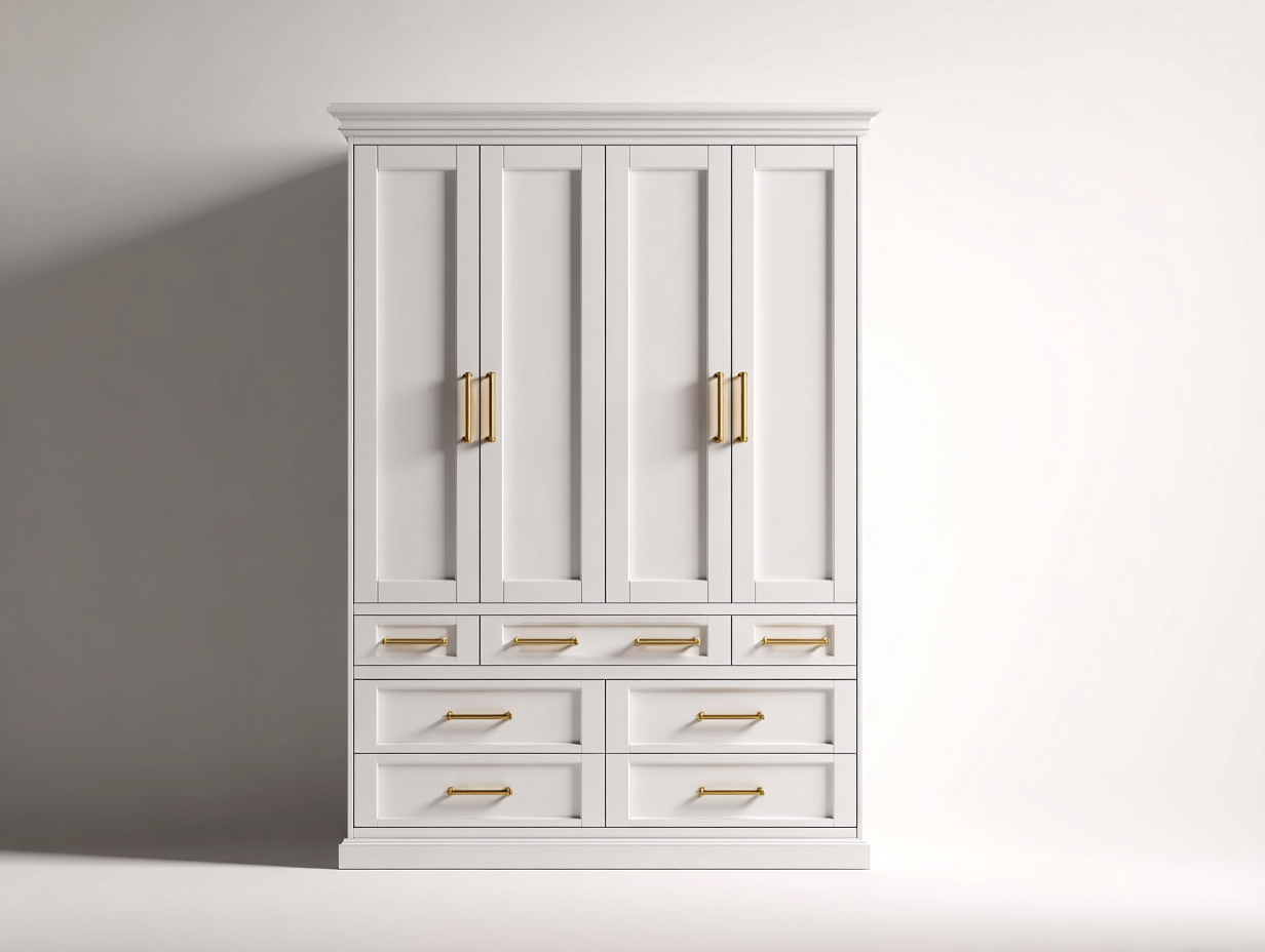 Armadio dal design classico ed elegante, ideale per organizzare abbigliamento e biancheria all'interno della camera da letto. La struttura equilibrata unisce spazio contenitivo e un'estetica raffinata adatta a diversi stili di arredo.