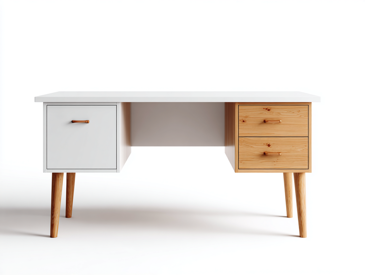 La scrivania presenta una combinazione di superfici di colore bianco e finiture in legno naturale. La lavorazione è studiata per garantire stabilità, resistenza e un utilizzo affidabile nel tempo.